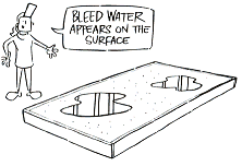 Bleed water will usually appear on the surface of the concrete after the initial screeding. Wait for it to evaporate before final finishing. Do not try to dry up excessive bleed water by using sand or cement as this only weakens the hardened surface. It can be removed by dragging a garden hose across the surface of the concrete.